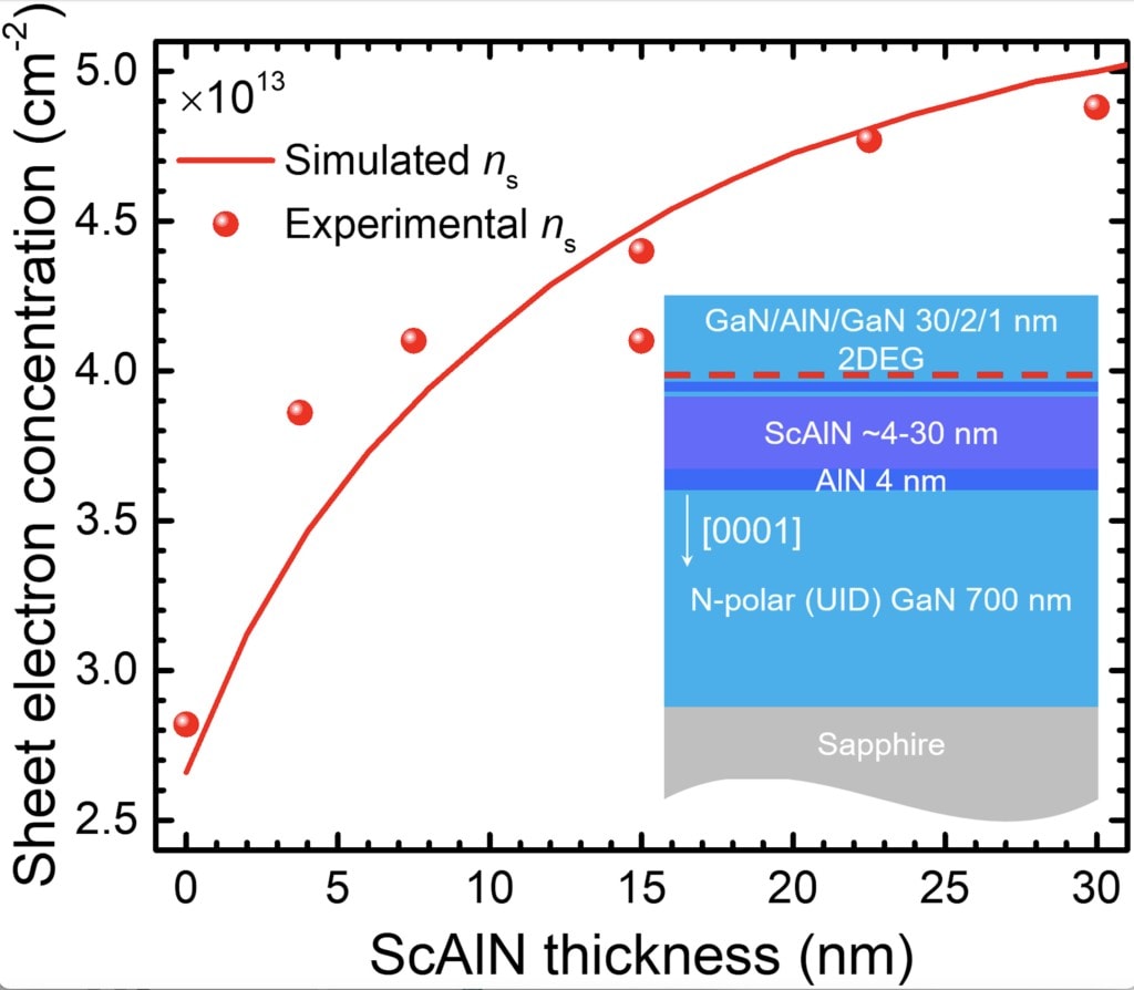 Sheet electron concentration for N-polar GaN high electron mobility transistors with varying ScAlN barrier thicknesses. Inset shows the corresponding schematic of the HEMT structure.