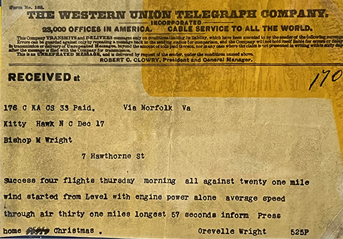 Detail of telegraph sent from Orville Wright to his father, Bishop Wright.